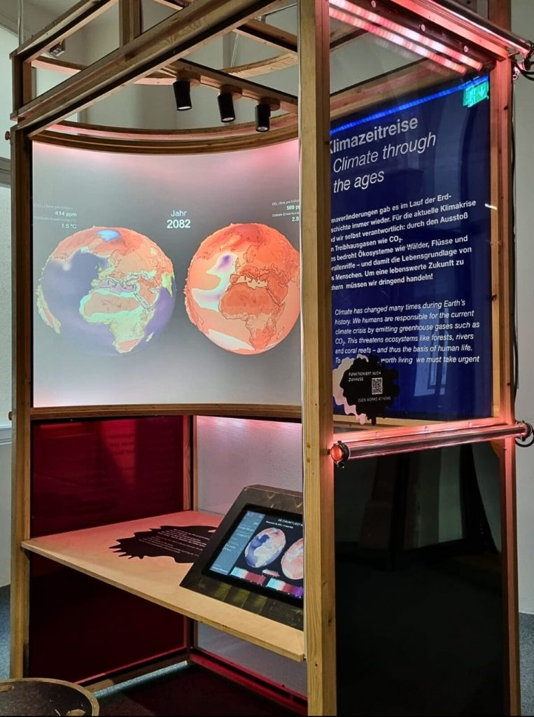 03 Beschreibung Die Medienanwendung Klimazeitreise, die bereits in der Sonderausstellung Klimawissen schaffen präsentiert wurde, sollte nun in das Displaymöbel Transformer integriert werden. Ein lichtstarker Laser-Projektor projiziert das Bild auf die Rückseite einer gewölbten Leinwand, wodurch zusammen mit einem Touchscreen-Terminal eine begehbare, interaktive Medieninstallation entsteht. Zusätzlich passt sich die Lichtanimation des Beleuchtungssystems dynamisch an die aktuell angezeigten Grafiken an. Graphscape realisierte […]
