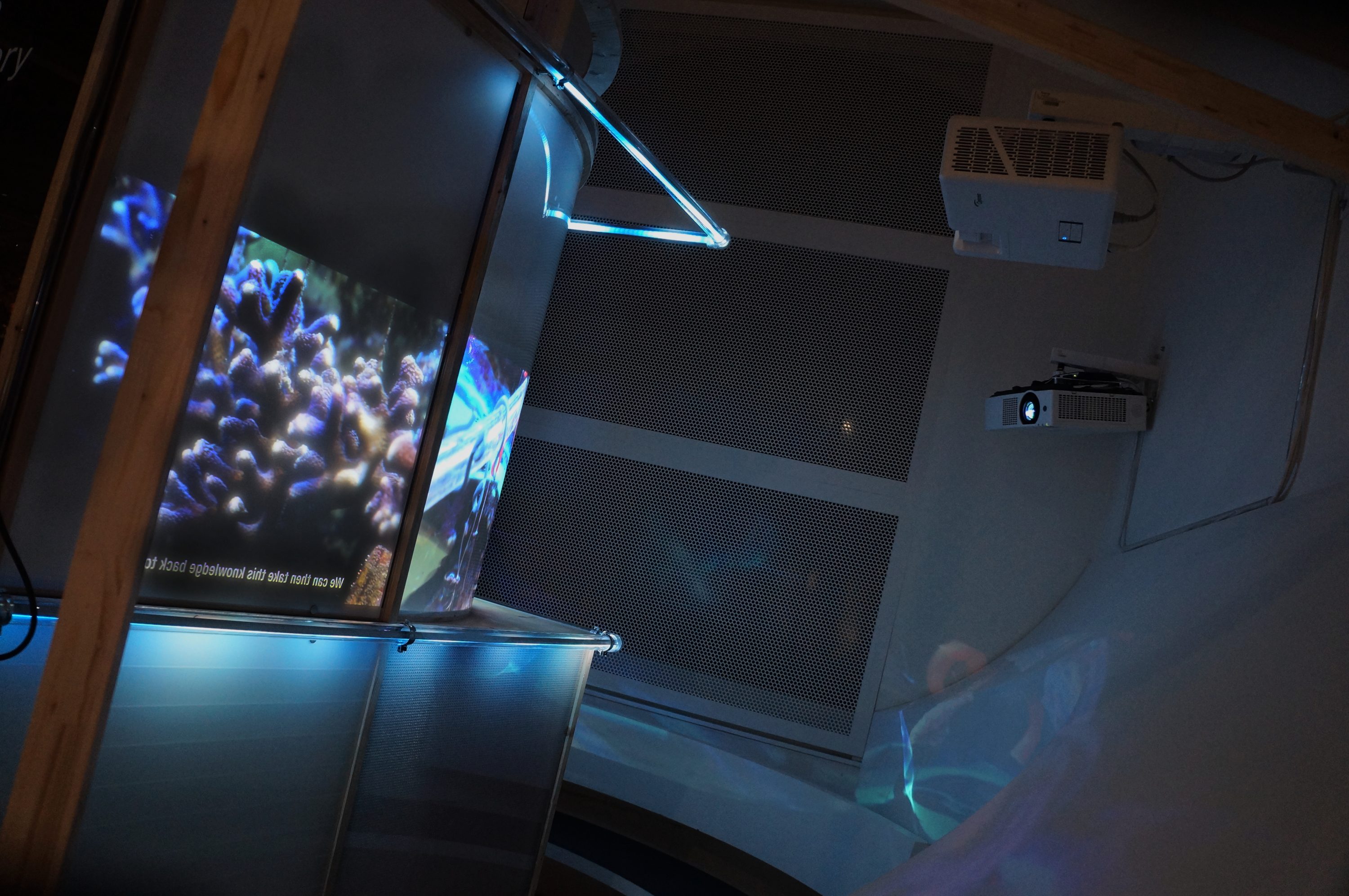 Das Herzstück des Forschunsaquarium ist eine Zweikanal Videoprojektion: Interviews mit Forschenden werden neben einer halbrunden Projektionsoberfläche mit stimmungsvollen Bilder gezeigt. Besucher:innen können in das Möbel eintreten und erleben die Inhalt mit einem räumlichen Eindruck. Aufgrund der Rückprojektionstechnik funktioniert das Ausstellungsstück von beiden Seiten. Schon beim Eintreten in den Ausstellungsraum fällt der Blick auf den rückseitigen Raum des Möbels und macht Neugierig den Inhalt zu entdecken.